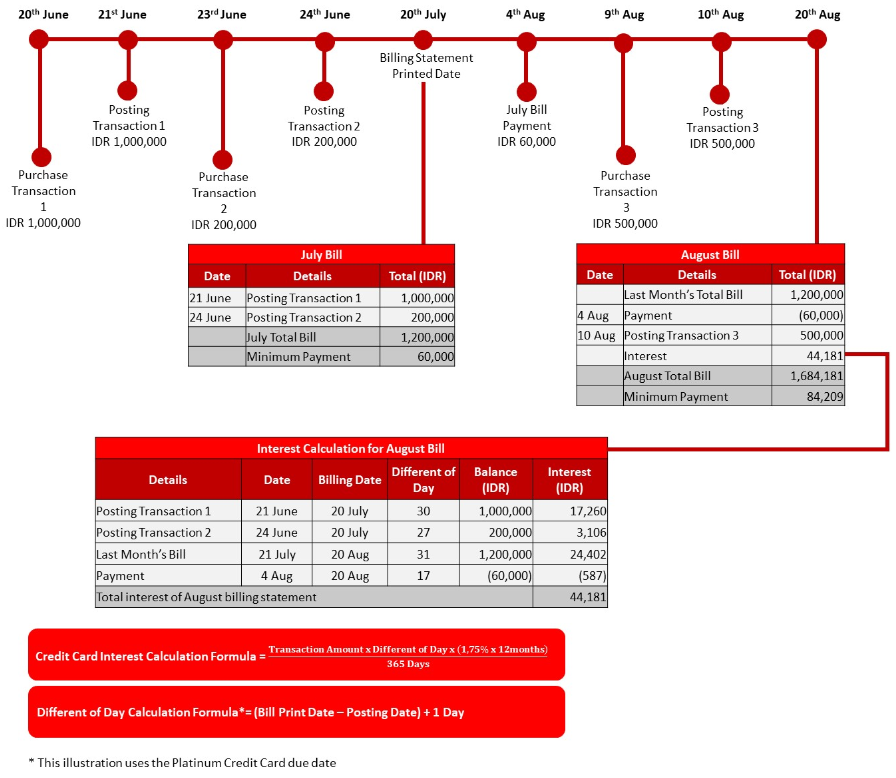 Interest will be charged if the Cardholder pays less than the total new bill, or pays after the Due Date. Interest for Shopping Transactions is calculated based on the Posting Date (Posting Date) of the transactions made. The interest rates that apply to purchase transactions are listed on the Billing Sheet. Unpaid costs, penalties, or interest are not included in the interest calculation component. Interest will be charged on the next billing sheet. For a complete interest calculation can be seen in the illustration of credit card interest calculations.